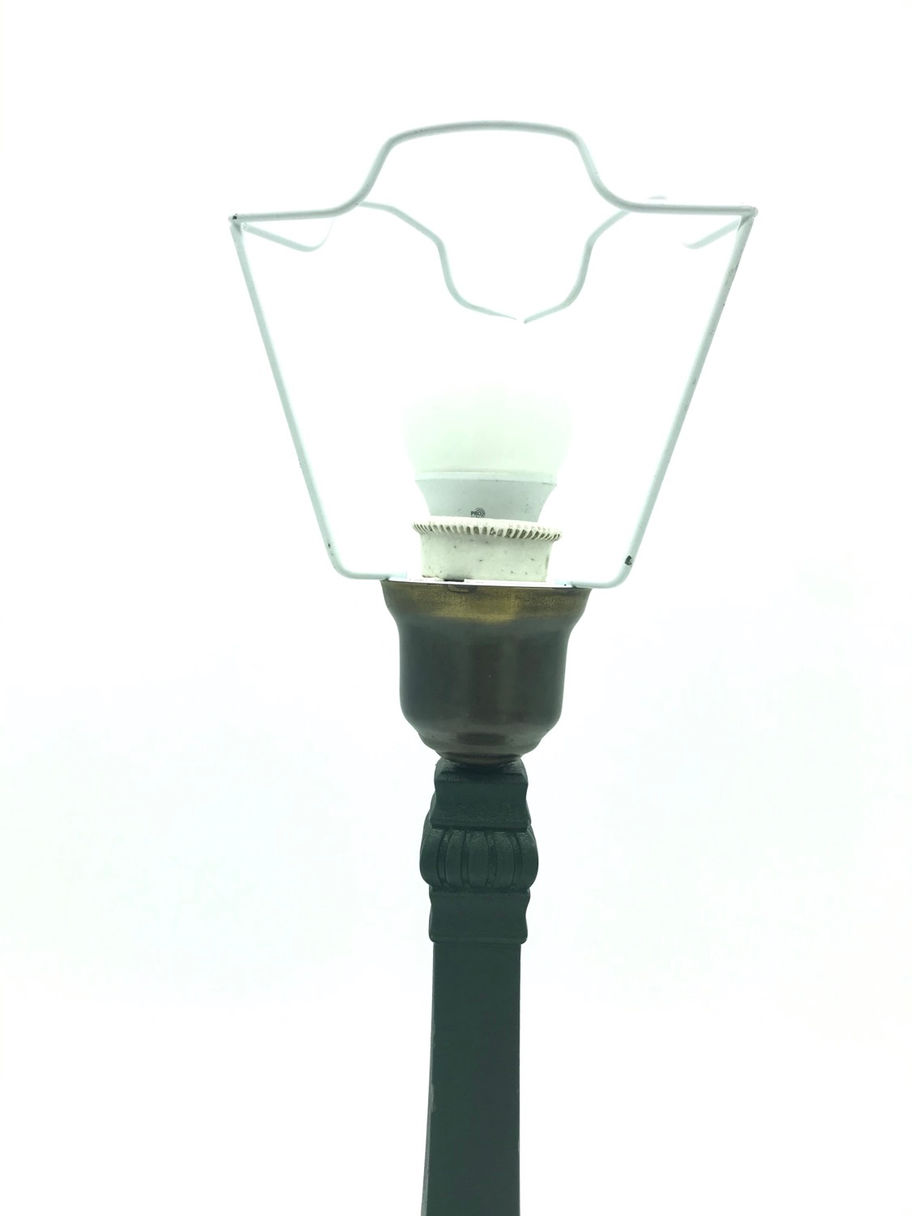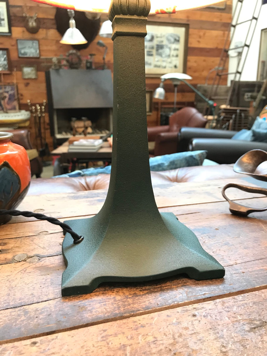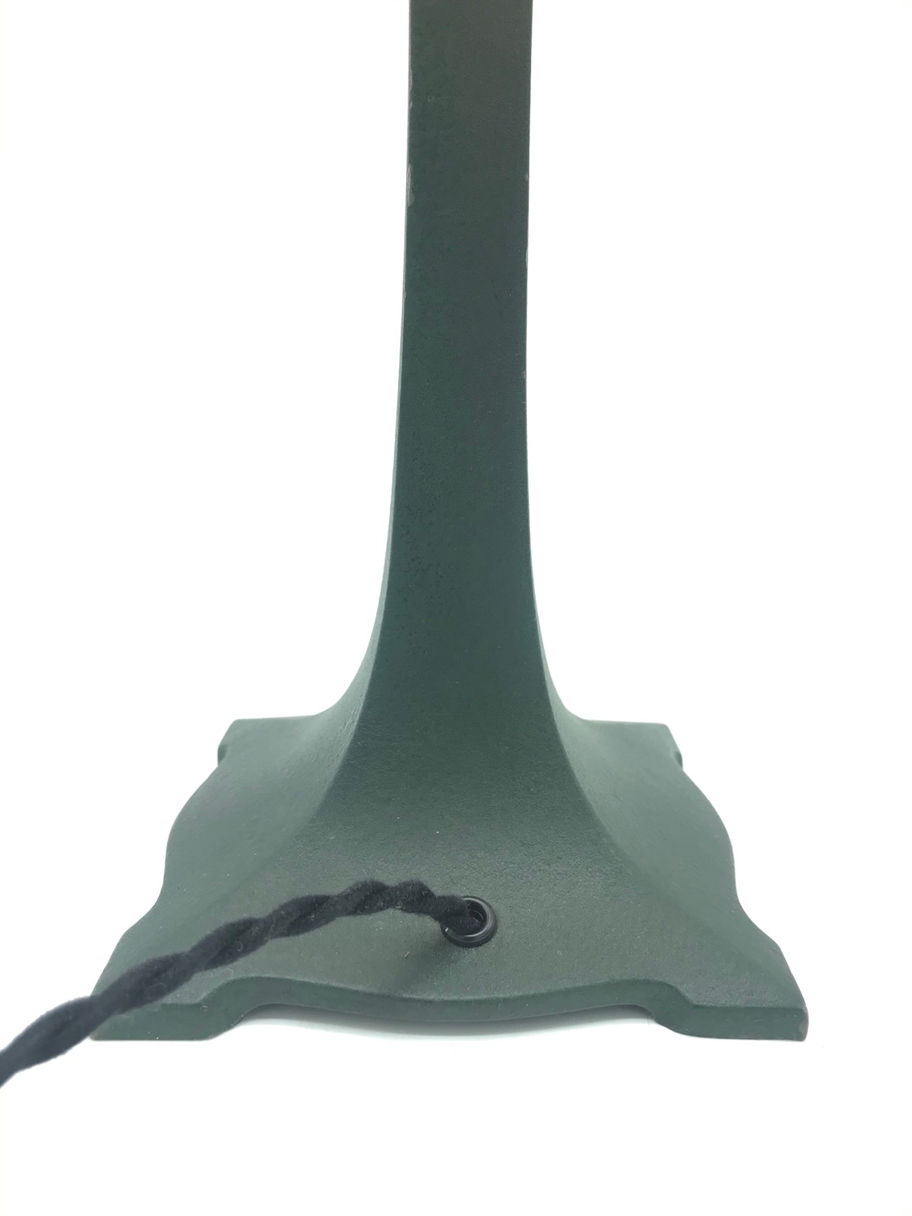 Beautiful Art Deco table lamp in bronze metal alloy and with original green paint to the surface.